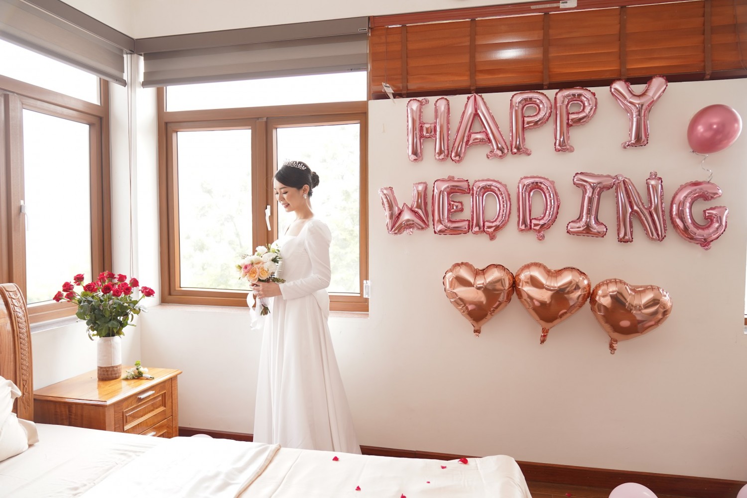 Về màu sắc, các gam màu trầm và lạnh như đen, xanh navy, xanh tím than, hoặc xanh rêu là lựa chọn lý tưởng để tạo hiệu ứng thon gọn. Nếu cô dâu vẫn muốn mặc váy cưới màu trắng truyền thống, hãy ưu tiên các gam trắng lạnh, tránh những tông màu ấm như trắng kem hoặc be, để giúp vóc dáng trông thanh mảnh hơn.